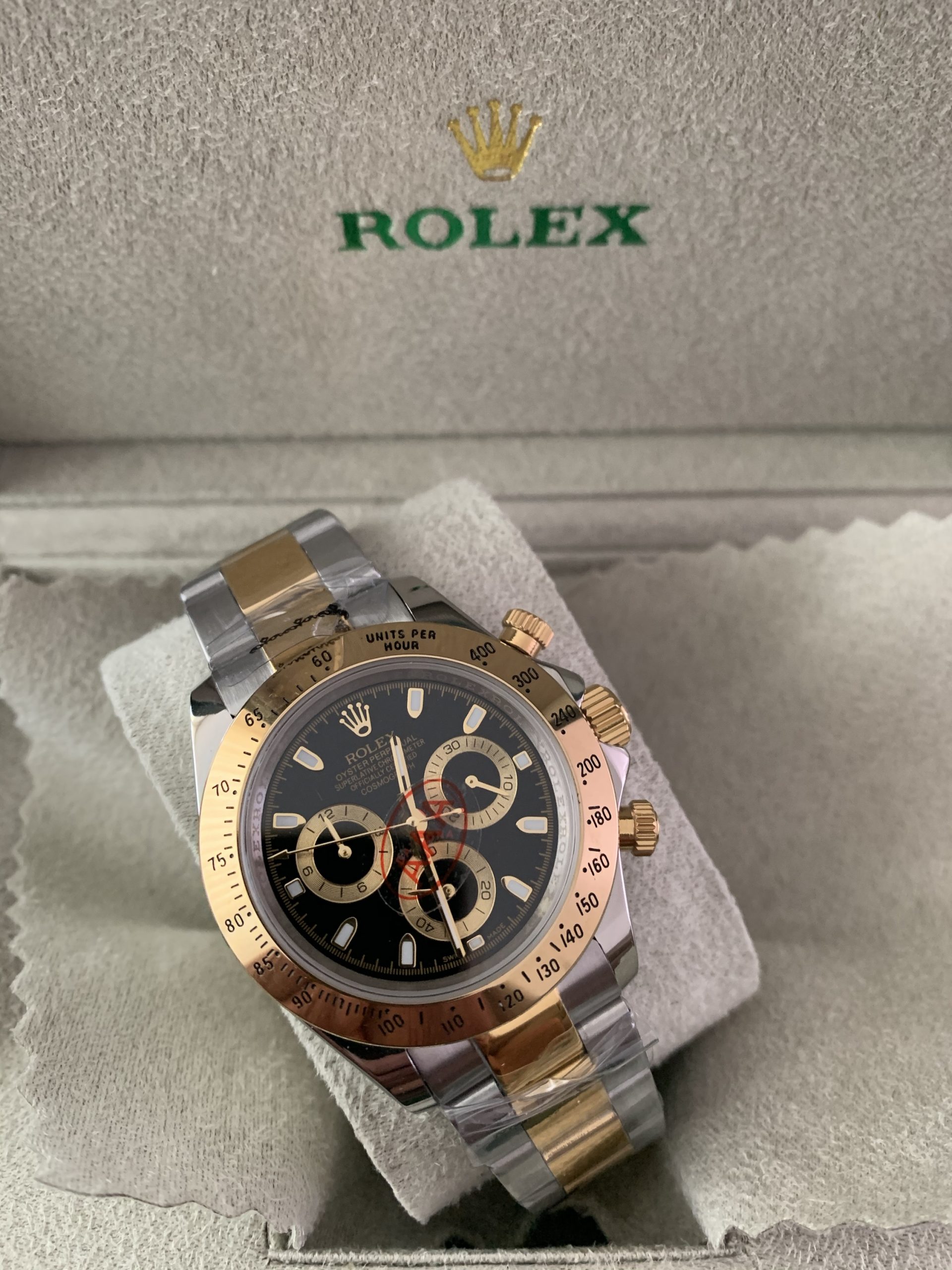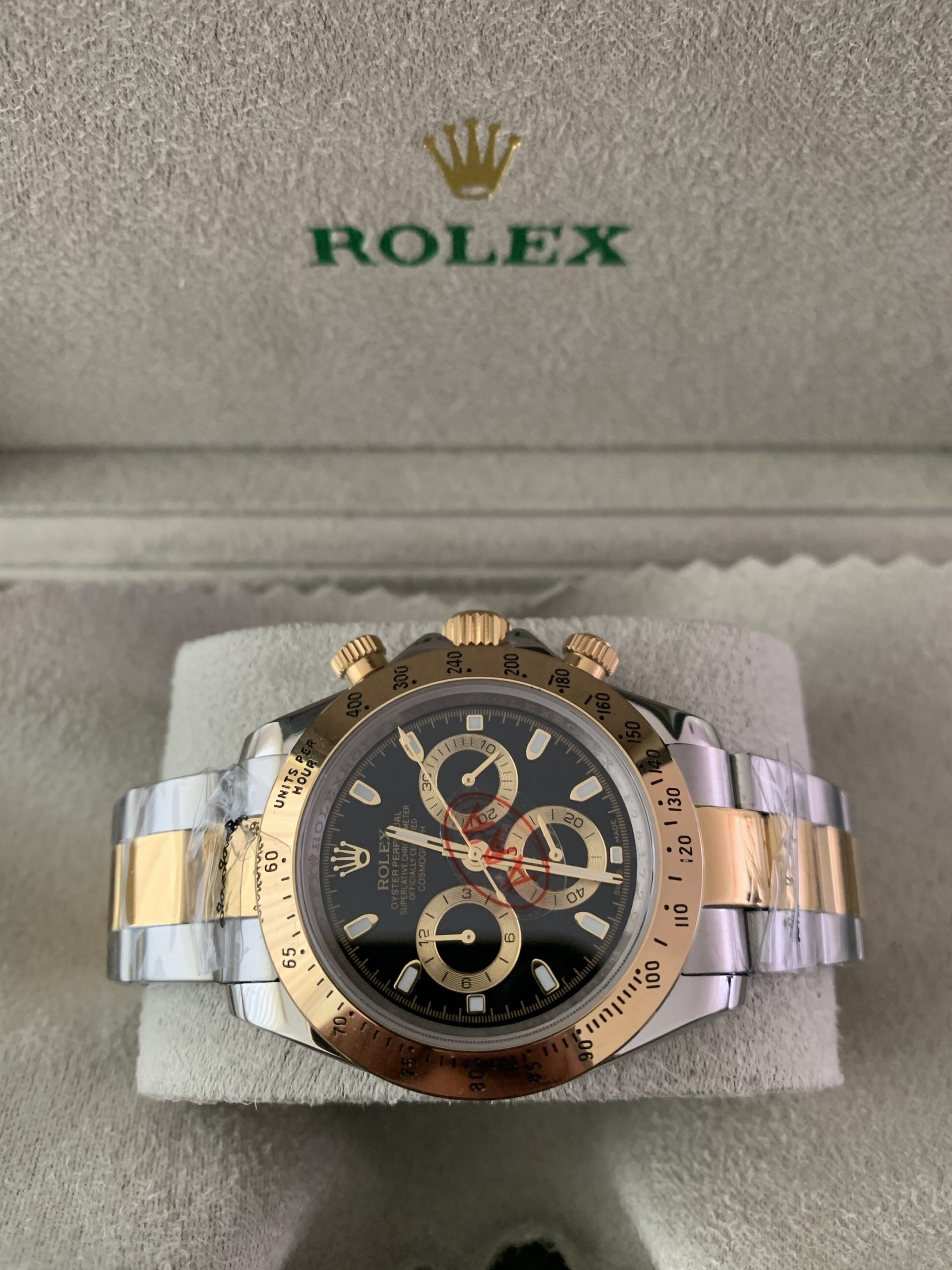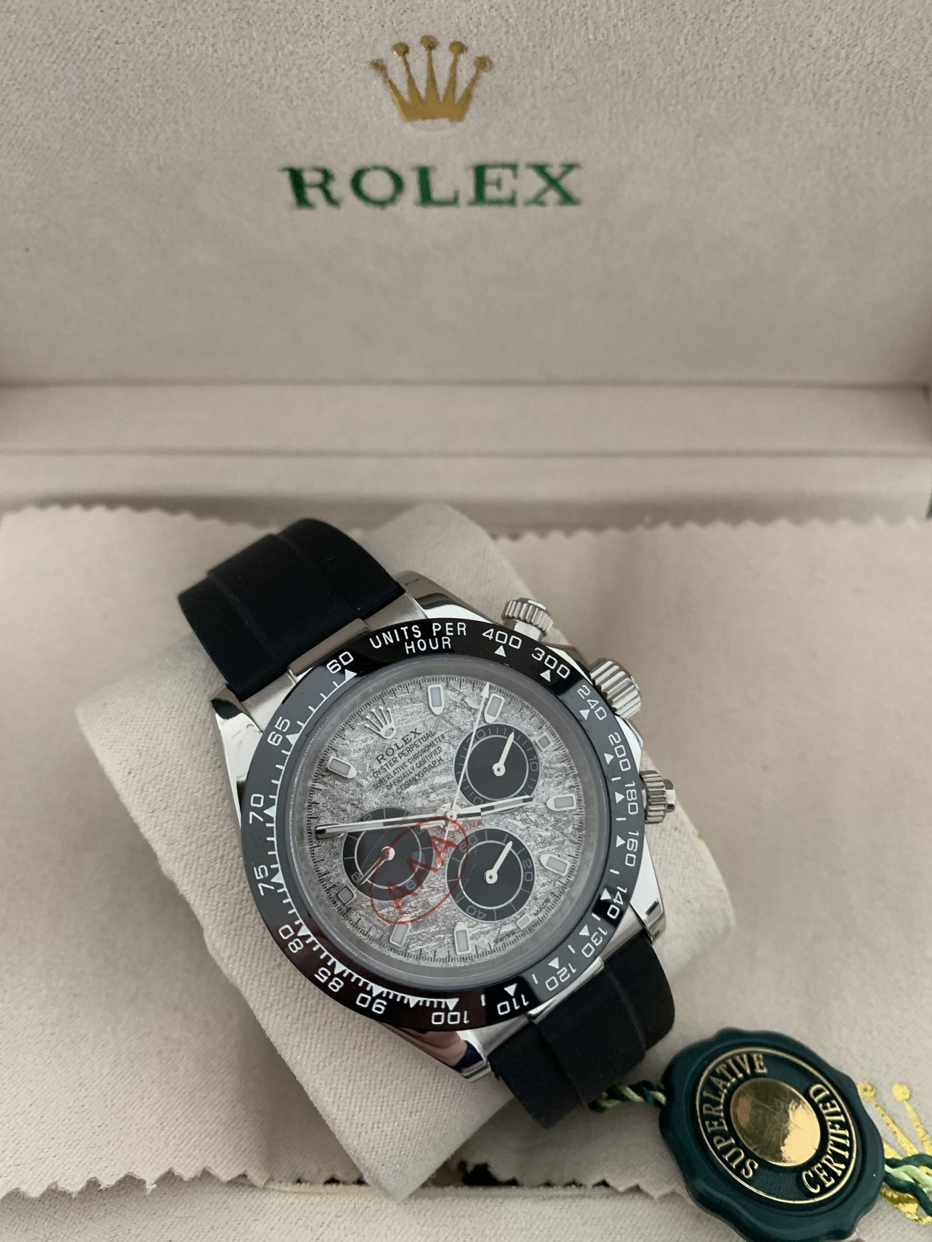 – Rolexkroon in het glas boven de 6 gelaserd